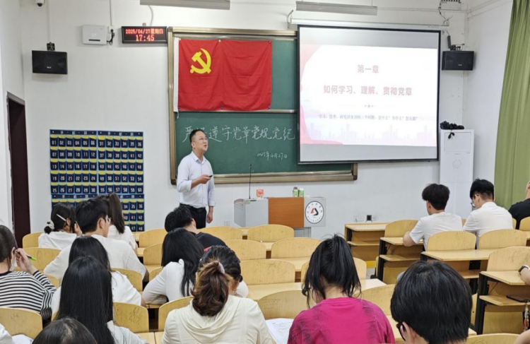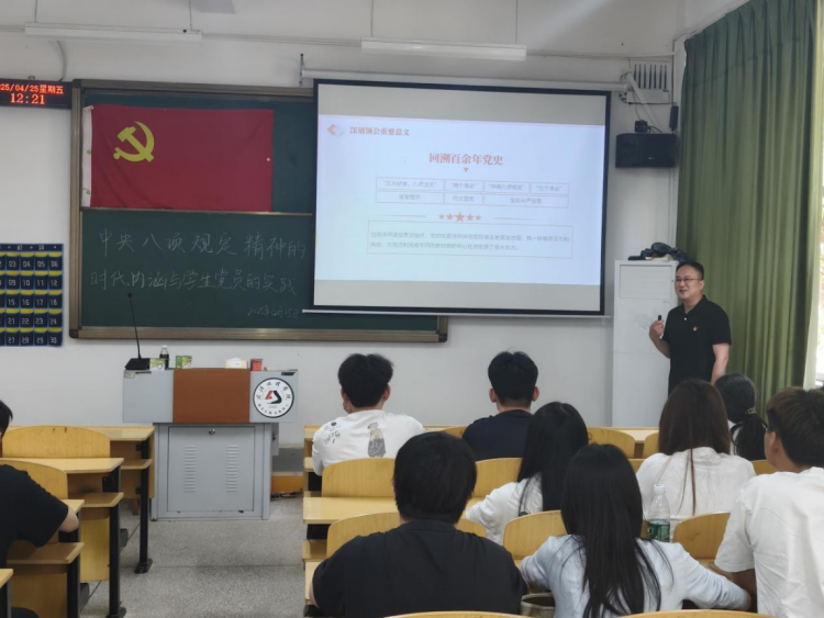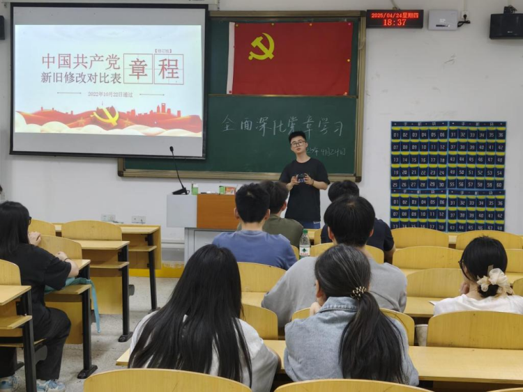 当晚,yl23455永利员工党支部书记方腾带来“全面深化党章学习”的专题。他把党章内容通过一幅幅历史长卷——南湖红船、遵义会议、两弹一星等让学员们感受那一条条条文背后凝聚的先辈意志。屏幕上,党章中的“十六字方针”与烽火硝烟交相辉映,年轻学子仿佛穿越时空,与历史对话。