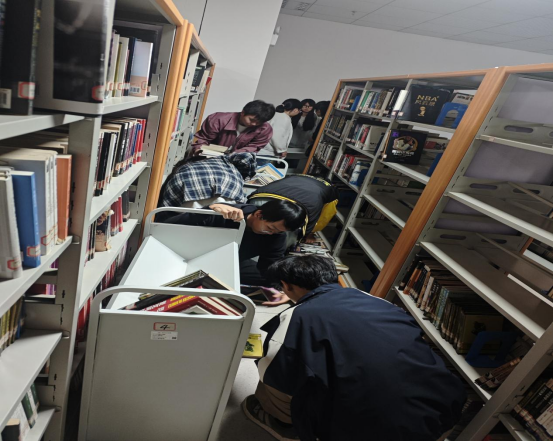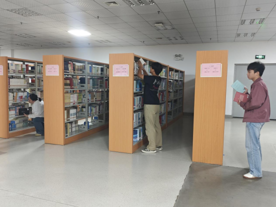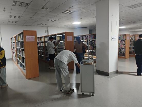 活动伊始,图书馆工作人员进行了任务讲解。随后18名同学迅速组建成3个小组,按照图书馆区域划分任务。各人员带着饱满的热情投入到书籍整理工作中,从书架间的狭长通道到堆满待整理书籍的角落,大家的身影成为了图书馆里一道充满活力的风景线。