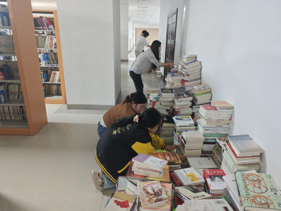 在图书馆书籍堆放区,大量零散图书堆叠成山,分类难度较大。有的同学或蹲或跪,仔细辨认每本书的类别与编号;有的同学则负责将同一类别的书籍集中堆放,为后续上架做好准备。面对夹杂在其中的老旧书籍和读物,大家耐心分拣,确保分类准确无误。