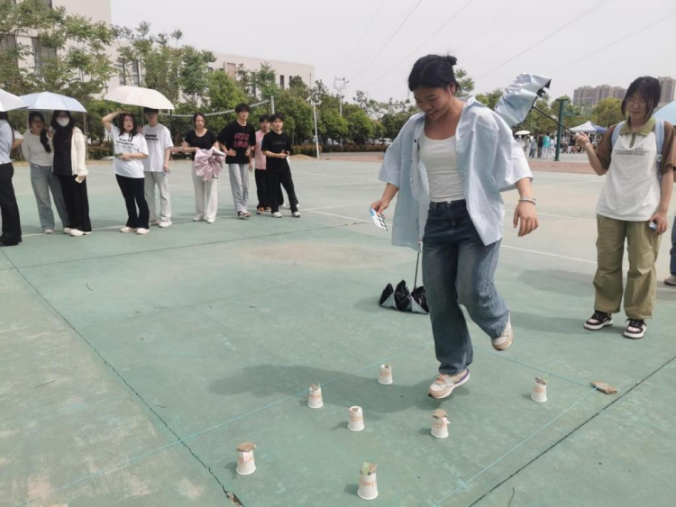 情绪迷宫摇身一变,成为了趣味十足的“纸杯任务阵”。数十个纸杯被精心摆成蜿蜒曲折的路径,每个纸杯下方都暗藏着一个任务纸条。参与者需单脚跳跃穿越这个复杂的迷宫,若不慎碰倒纸杯,则需完成纸条上的趣味任务。现场传来一阵阵尖叫声与欢笑声,同学们在平衡力与运气的双重考验中,既锻炼了身体协调性,又获取了意想不到的惊喜与乐趣。