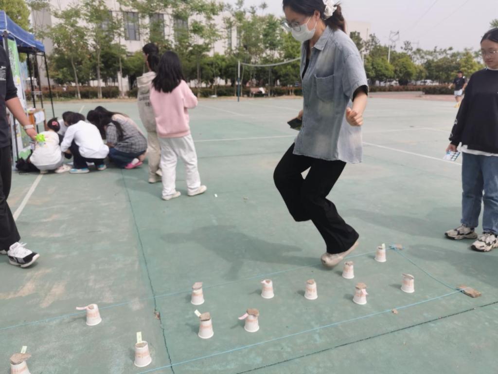情绪迷宫摇身一变,成为了趣味十足的“纸杯任务阵”。数十个纸杯被精心摆成蜿蜒曲折的路径,每个纸杯下方都暗藏着一个任务纸条。参与者需单脚跳跃穿越这个复杂的迷宫,若不慎碰倒纸杯,则需完成纸条上的趣味任务。现场传来一阵阵尖叫声与欢笑声,同学们在平衡力与运气的双重考验中,既锻炼了身体协调性,又获取了意想不到的惊喜与乐趣。