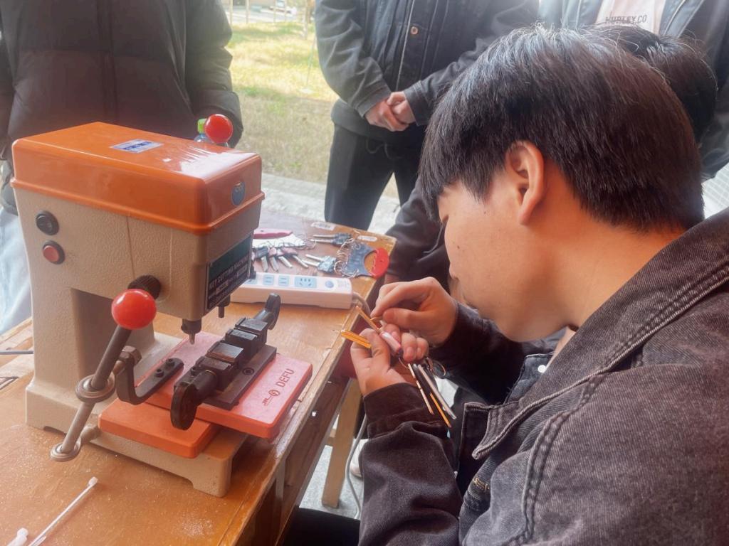 在3号楼一层的服务点上,由数名机械设计制造专业员工组成的志愿服务团队俨然成为校园闪亮的星。他们操作着数控钥匙机,将工科专业的优势转化为民生服务实践。精密测量、模具选配、锉刀加工,每个环节都彰显着智能制造时代的工匠精神。活动首日即接待师生150余人,配制的200余把钥匙中,既有传统弹子锁,也包含宿舍及办公室的防盗锁等。