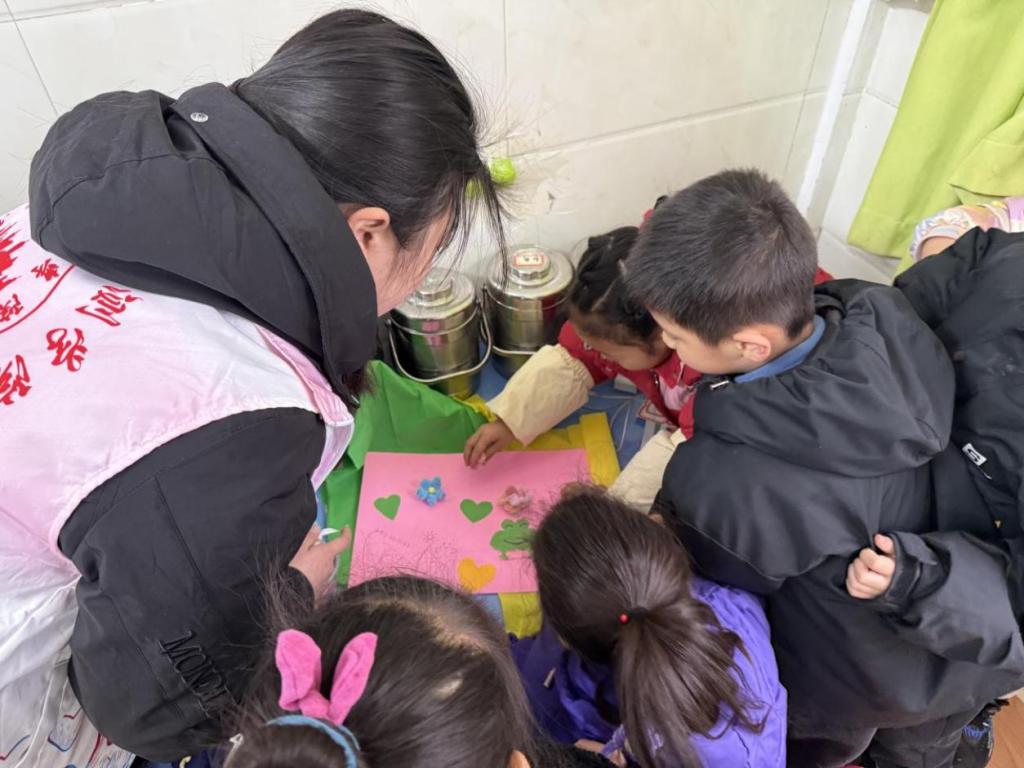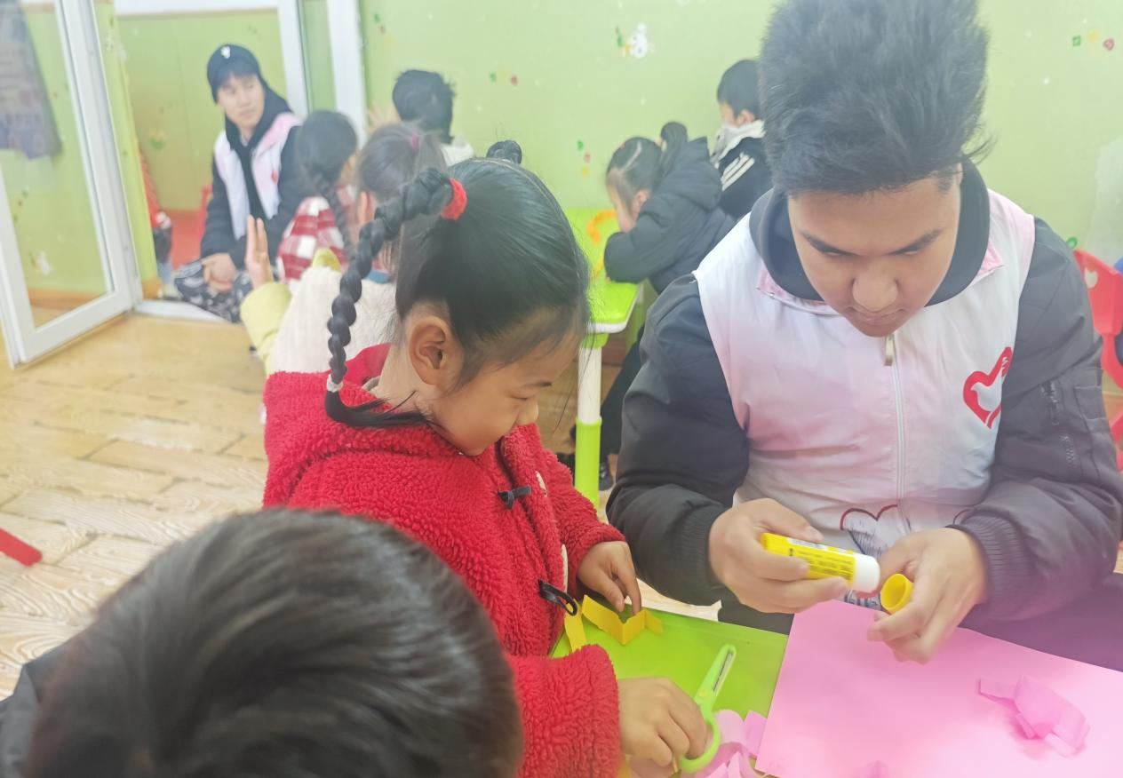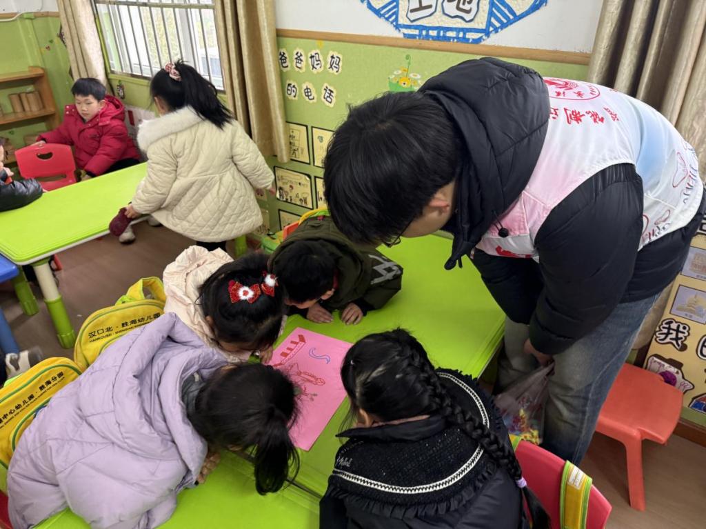 在“巧手童心做手工,小小雷锋献爱心”环节,志愿者们创新采用“1+1”结对模式,带领幼儿制作手工贴画。这些承载童真祝福的手工礼物,次日便由志愿者转交社区独居老人,形成跨代际的温暖传递。