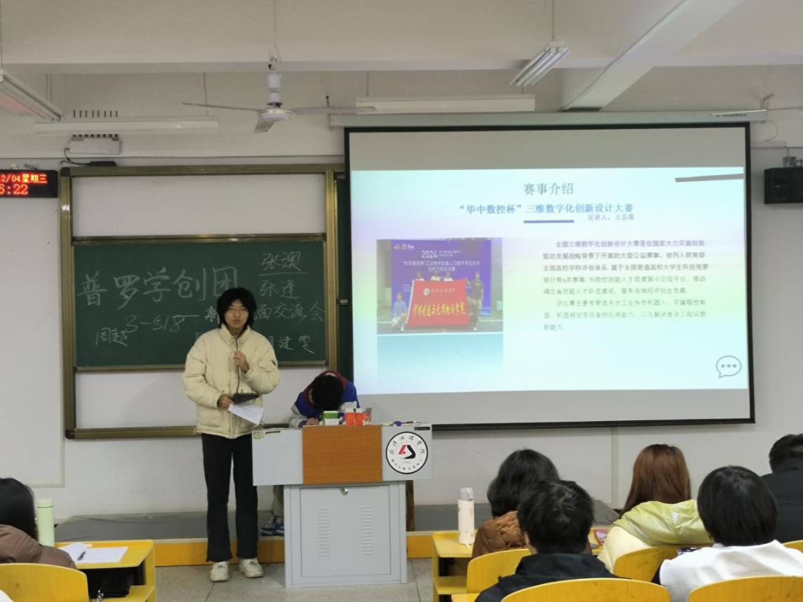 王昊骞学长为同学们介绍了“华中数控杯”三维数字化创新设计大赛。该比赛主要考察选手对工业协作机器人、可编程控制器、机器视觉等设备的应用能力,以及解决复杂工程问题的水平。