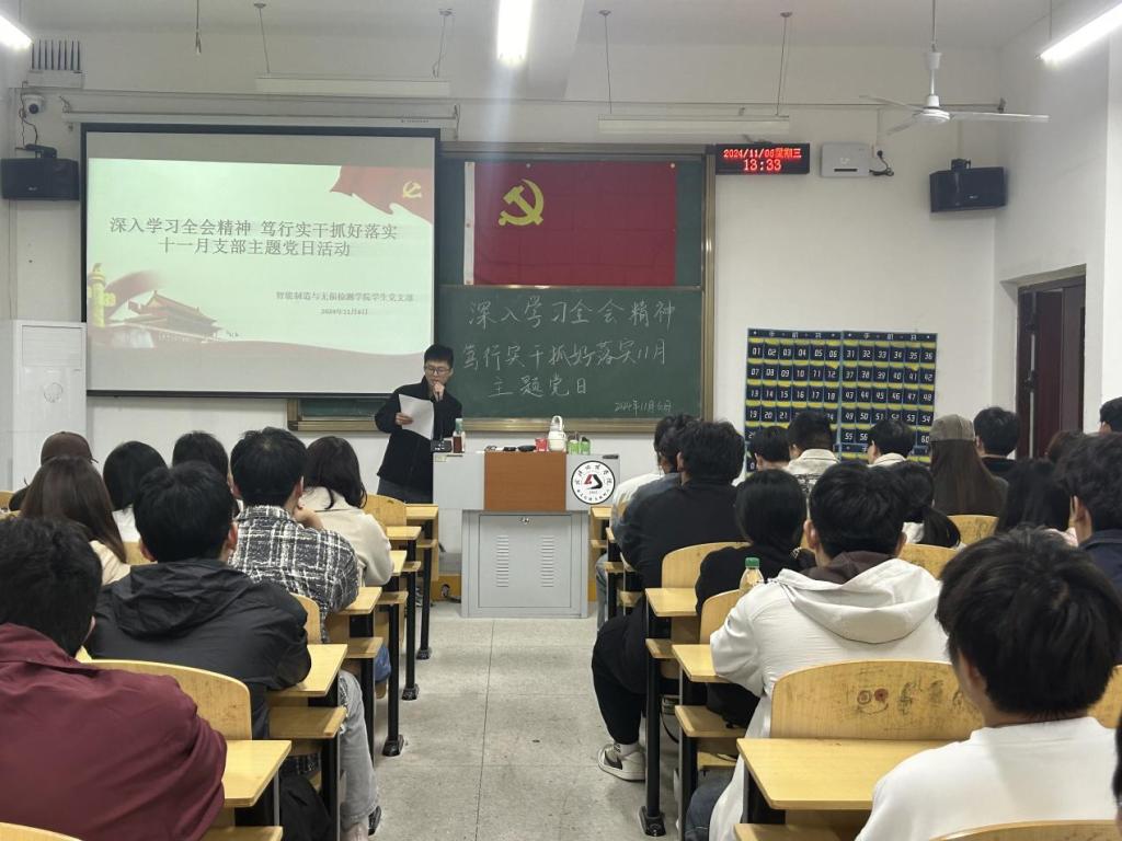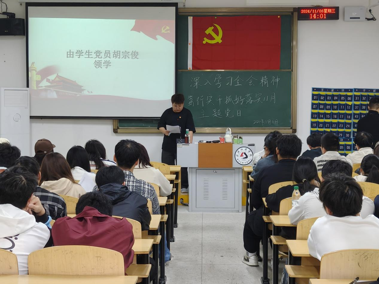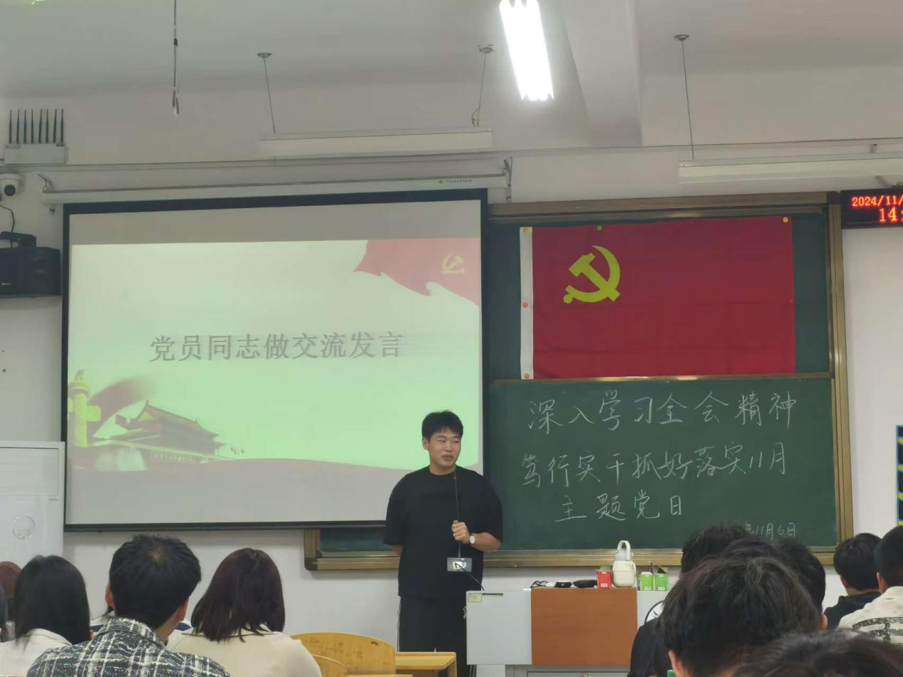 随后,党务小组负责人胡宗俊同志接过了学习的接力棒,他领学了《习近平在安徽考察时强调:发挥多重国家发展战略叠加优势,奋力谱写中国式现代化安徽篇章》和《习近平在省部级主要领导干部学习贯彻党的二十届三中全会精神专题研讨班开班式上发表的重要讲话》。胡宗俊同志的讲解深入浅出,让在场的每一位同学都深受启发。