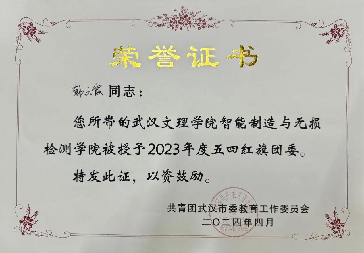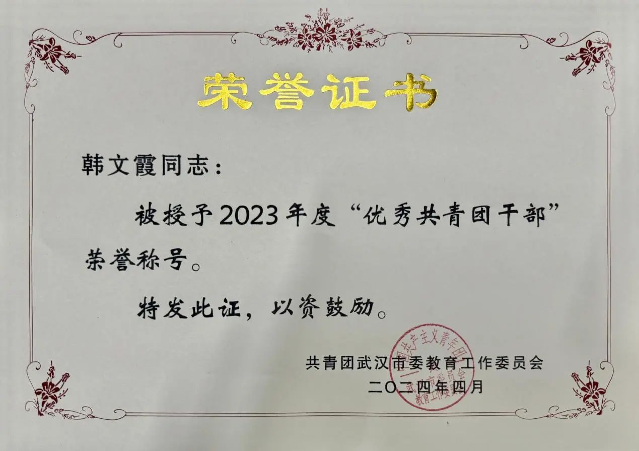 在2024年共青团武汉市教育工作委员会(下文简称:教工委)“五四评优”活动中,yl23455永利分团委以其卓越的组织能力、丰富的活动内容和突出的工作成效,荣获“五四红旗团委”的光荣称号。同时,yl23455永利分团委书记韩文霞同志也凭借优秀的工作成绩和无私的奉献精神,荣获“优秀共青团干部”的殊荣。