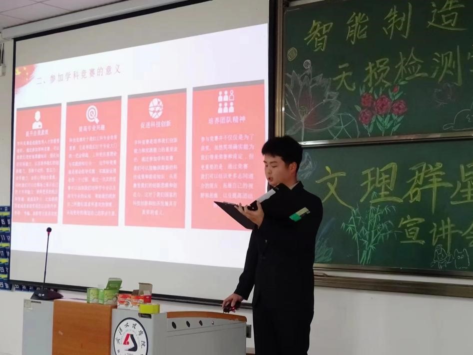 而后登台的是21级机制专业的刘康。他以自己学科竞赛的经历,向与会师生分享了许多比赛经验,总结了应对竞赛的独到见解。他谈到,参加竞赛第一要有扎实的基础知识,一定要多学习多尝试;第二要注重团队协作,发挥各自优势,共同攻坚克难;第三要具备创新思维,从多角度思考,提出独特方案;第四要有计划安排,合理规划时间,积极参加模拟竞赛;第五要内心强大,坚定信心,克服重重困难挑战。