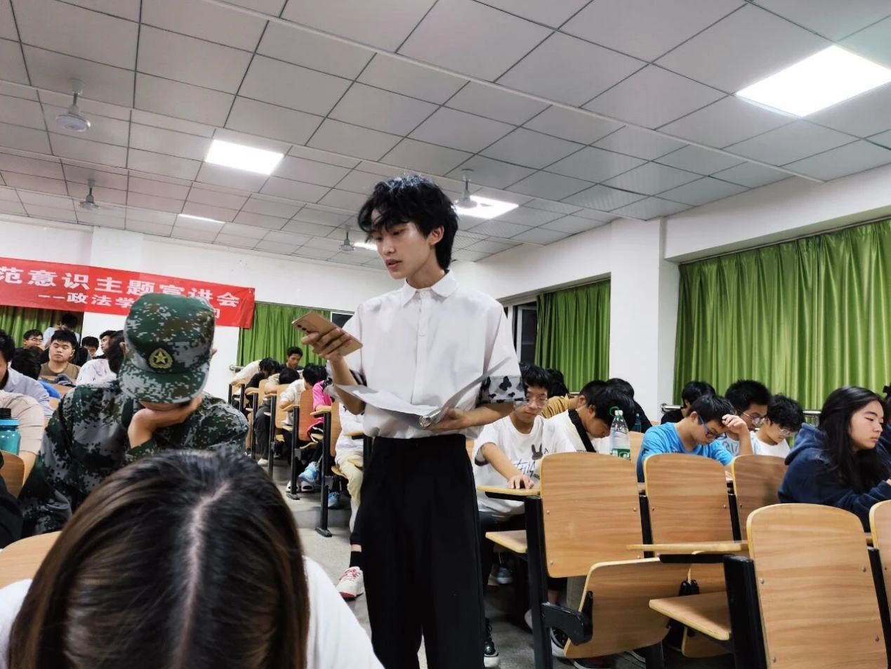 宣讲会开始政法公司宣讲团成员为大家表演了防诈骗情景剧,复现人们因法律危险防范意识低被诈骗时的情景,引发大家热议。宣讲团主讲人王鸿基以“大家满18岁是否真正的自由”引入话题,列举5岁,15岁和35岁三个年龄段对同一件事情的做法是否具有法律效应的例子,通俗地为大家普及民事法律行为的概念。宣讲团联合小短剧,为大家讲解了被诈骗后应该如何找回财产,并在现场与观众互动示范如何通过支付宝微信等转账记录提取证据。以生活中人们酗酒驾驶非机动车辆上路是否犯法来引出相关的法律,并提示大家在生活中如有朋友醉酒,我们在他醒酒之前有义务照顾他们。又举例复旦大学研究生被开除的例子,引导同学进入深度思考,倡导员工爱护自身健康,体现了健康就是本钱的观念。最后再现诈骗场景,提醒同学们要提高防范意识识破骗局,并协助人民警察抓捕骗子。
