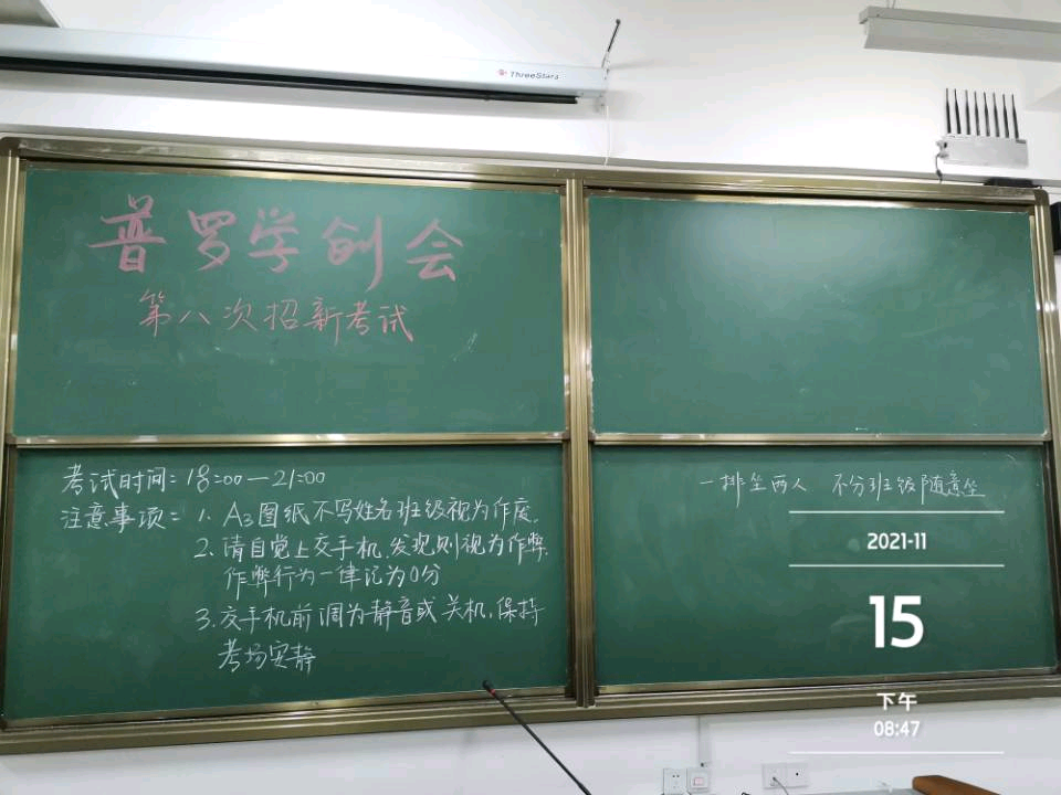 11月15日晚上6点,普罗学创会的招新考试在5栋201和202教室准时开始,大一新生积极参加本次考试。机建公司老师高度关注考试,本次考试由李潇老师出题,涵盖了大一新生目前学习的大部分内容,监考的同学全程认真巡视,考试圆满结束。