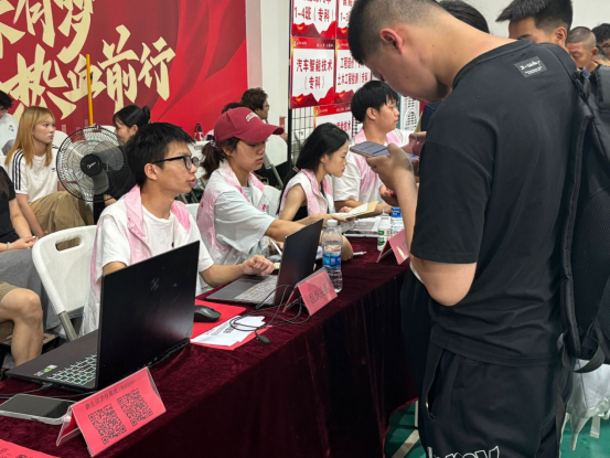 报到现场处处透着细致与温暖。工作人员提前梳理好流程,将各类迎新物资整齐摆放;志愿者们主动上前接过新生手中的行李,耐心指引报到步骤,从信息登记到材料核验,每一个环节都高效有序。这份周到服务,让初来乍到的新生卸下了陌生与局促,真切感受到了智检大家庭的接纳与关怀。