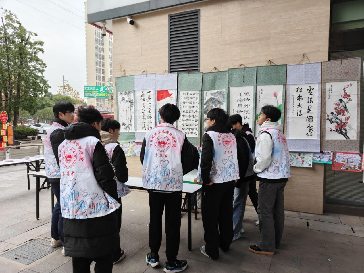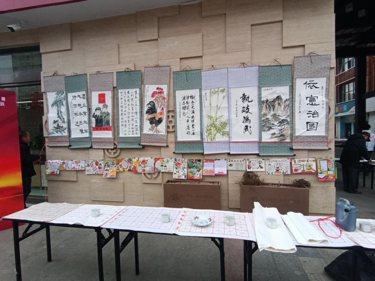清晨七点,志愿者们准时抵达活动现场,迅速投入筹备工作。他们有条不紊地摆放桌椅、整理宣传物料,将一幅幅蕴含法治内涵的书法绘画作品精心布置于墙面。从作品陈列的间距调整到宣传区域的功能划分,志愿者们以细致周到的筹备工作,为活动营造出庄重有序且温馨浓厚的法治宣传氛围。