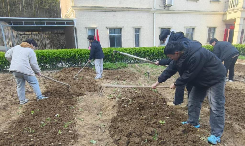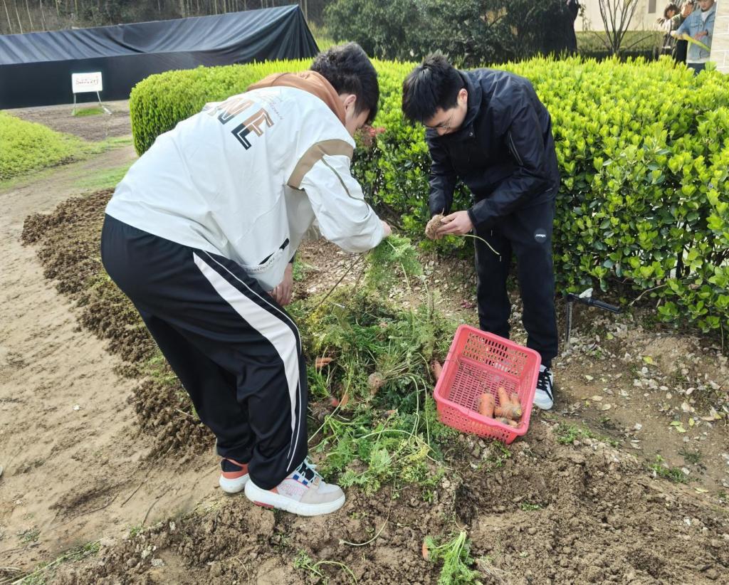 “乾坤大挪移”,员工们有条不紊地展开了锄地、拔胡萝卜和运送柴火的劳动任务。活动分为“土地深耕”和“薪火相传”两大块,同学们手执农具,全神贯注地翻整着田地,同时协作配合,搬运木柴铺设起生态步道。在晨光的照耀下,他们的汗水闪耀着青春的光芒,专注耕作的身影与山间的春色相互映衬,构成了一幅美丽的画面。