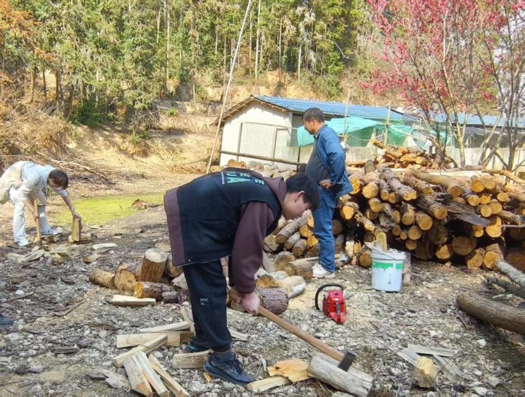 “霹雳无敌手”,同学们被分成四个班组,手持斧头,眼神坚定而专注。他们一下又一下地挥舞着斧头,精准地劈砍着木柴。汗水不断从额头滑落,浸湿了衣衫,但没有人抱怨疲倦。这个项目不仅是对体力的锻炼,更是对意志的考验。在劳动的过程中,同学们深刻体会到了付出与收获的道理,他们的成长足迹也牢牢地印刻在了这片山林间。