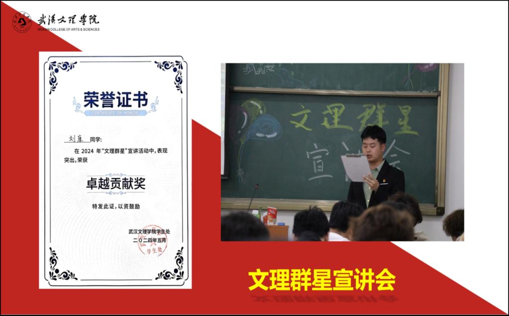 在“文理群星”宣讲会上,为学弟学妹传授学习与竞赛经验,努力做好榜样带头作用。