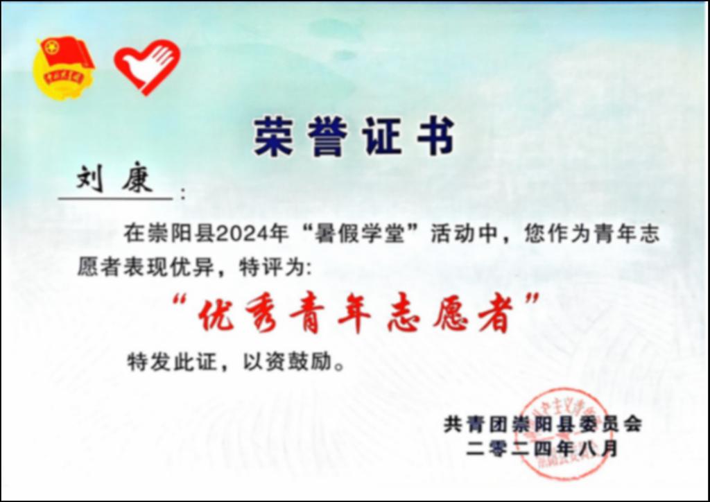 老员工应该为社会贡献自己的青春力量。因此,刘康积极参加志愿服务活动,累计志愿服务时长达200小时。参与过入伍政策宣传、“三下乡”、协助乡村疫情防控工作、暑期招生宣传、核酸检测志愿者、迎新生、扫雪志愿行动、为新生发放教材等志愿活动,被评为“优秀青年志愿者”。为了将所学知识应用到实际工作中,他利用寒暑假在校外积极寻找实习兼职,不断学习和积累经验。在校内协助老师维修机床等教学设备,为医学实验楼刻配钥匙等。