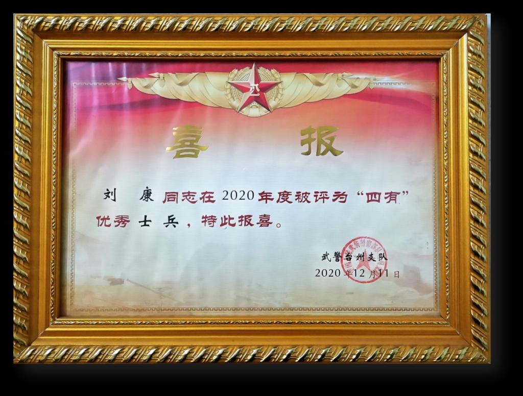 2019年刚步入大公司门的他,毅然决定投笔从戎,应征入伍。在军队里,他刻苦训练、主动作为。在担任中队新闻报道员期间,发表新闻共计50余篇。在6.13温岭槽罐车爆炸事故发生时,他主动写下请战书,奔赴事故救援一线,担负打通救生通道、解救人民群众的使命。在台风期间,参加抗洪抢险,抢救人民群众生命财产安全。因表现优异,刘康被武警部队特评为“四有”优秀士兵,授嘉奖一次。