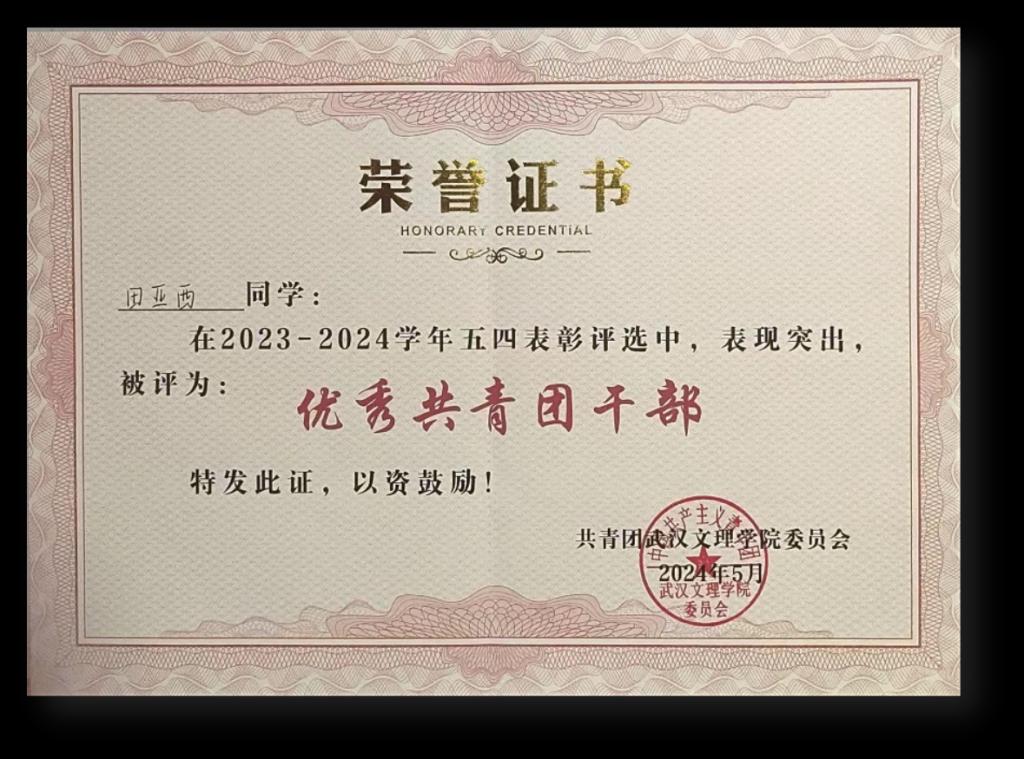 在大学的三年里,田亚西时刻不忘初心,积极在学习和生活中发挥先锋模范作用。作为班级团支书,他积极组织各类团日活动,增强班级凝聚力和员工思想素养,让大家在党团的指引下收获成长与进步。任团支书期间,他在公司“五四表彰”评选中获评“优秀共青团干部”。今年上半年,成功被党组织吸收为中共预备党员,这让田亚西对未来有了更加光荣的使命和不竭的动力。