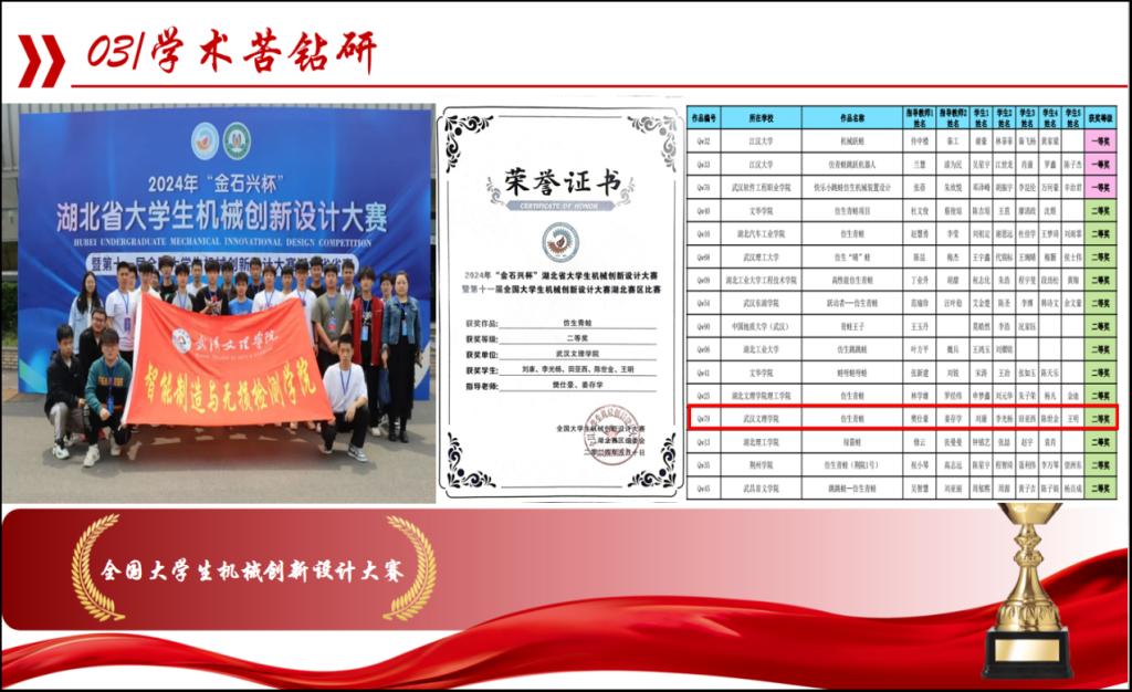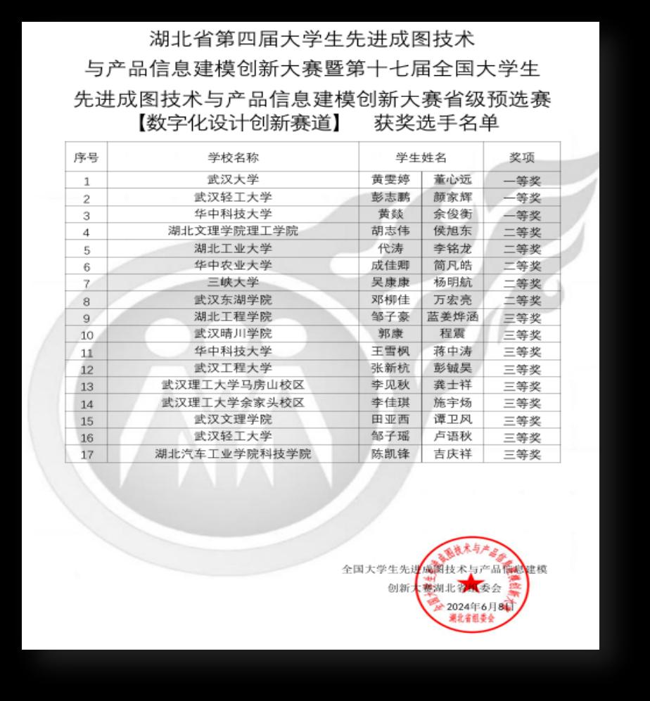 实践是检验专业学习的试金石,因而田亚西从不放过每一个可以锻炼自己才学的机会。三年中,他积极参加各类学科竞赛,累计收获1项国家级荣誉、5项省级荣誉以及十余项校级荣誉。全国老员工机械创新设计大赛,他们团队设计的仿生青蛙获得省级二等奖,且排名位居公司所有参赛队伍第一名;在全国应用型人才综合技能大赛,他们设计的“抗震救援小车”成功斩获国家级三等奖,终结了公司在该比赛中连续三年未能获奖的记录,为公司赢得了宝贵的荣誉和认可。在全国老员工先进成图技术大赛数字化创新赛道中,他们与华中科技大学、武汉大学等高校进行同台竞技,狭路相逢勇者胜,在夜以继日的奋斗中,他们设计的“纸袋开袋设备”成功在众多参赛队中脱颖而出,成为17支获奖团队之一,作为公司首届在此赛道获奖的队伍,他们填补了公司在这场赛事的空白,同时该项目已在国家知识产权局申请外观设计专利。