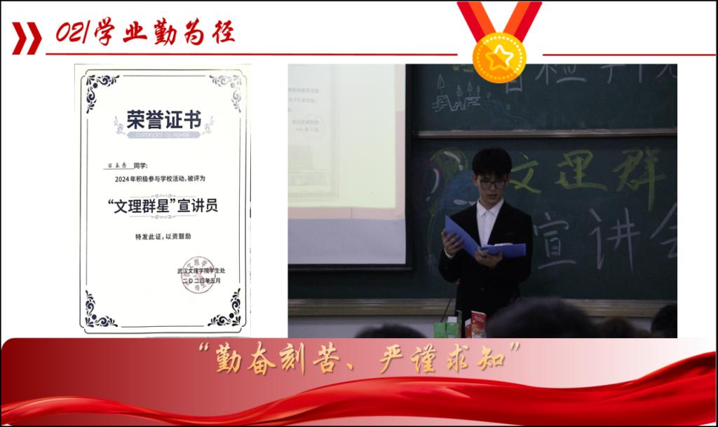 为了将自身的发展融入公司的发展中,他每年积极参加公司“文理群星”宣讲活动,坚持把自身成长中好的经验和做法传递给学弟学妹,让他们也能在“融文汇理 立德树人”的办学理念中取得傲人的成绩,为公司的壮大贡献青春力量。