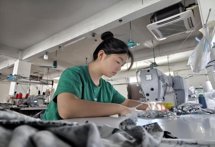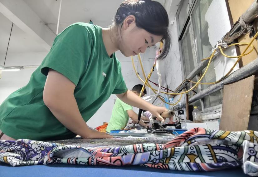 初入制衣厂时,高强度的工作节奏让李赛琪颇感吃力。“腰和脖子像被上了发条,傍晚时分总会发出酸痛的抗议...”她回忆道。面对重复的锁边、熨烫工序,这位00后女孩也曾因工价低产生动摇,但流水线上的温暖很快消解了她的疲惫—班组阿姨手把手传授省时技巧,工友们在精神倦怠时用方言闲聊提神,这些细碎的互动让她逐渐适应了节奏。一个月后,她的操作速度得到了显著的提升,更在熨烫工序中摸索出独到经验。