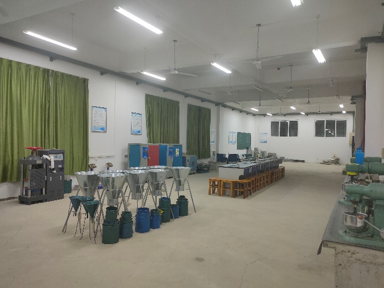 建筑材料实验室现有设备如下:液压式压力实验机1台,水泥强度压力实验机1台,电动抗析机1台,水泥负压筛析仪1台,砼水泥恒温、恒湿养护箱2台,水泥胶沙搅拌机6台,水泥净浆搅拌机6台,水泥胶沙振实台6台,雷氏沸煮箱2台,电热鼓风干燥箱1台砼振动台1台,砂浆稠度仪7台,电子天平8台,混凝土搅拌机1台,一体式钢筋位置测定仪1台;