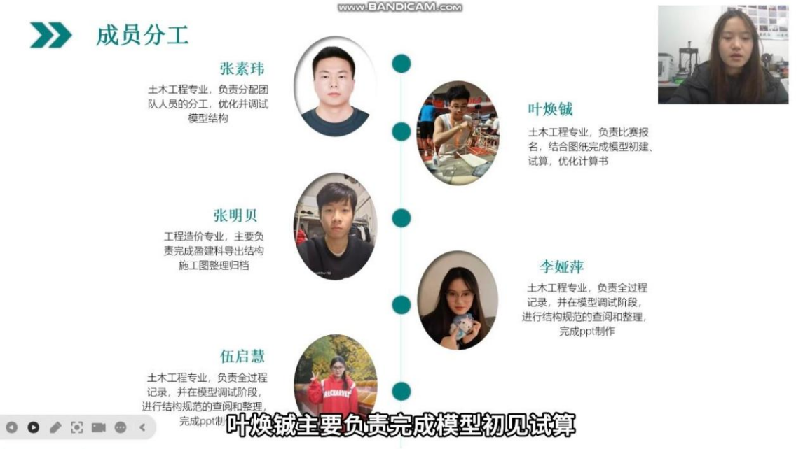 本次比赛,参赛队员张素玮,叶焕铖,伍启慧,李娅萍,张明贝等5名同学充分利于课余和周末时间,在实验室完成赛前准备并按照任务书完成赛题要求的提交。比赛中,队员们需要深入运用所学结构及力学等知识,体现实际操作软件进行设计的能力。