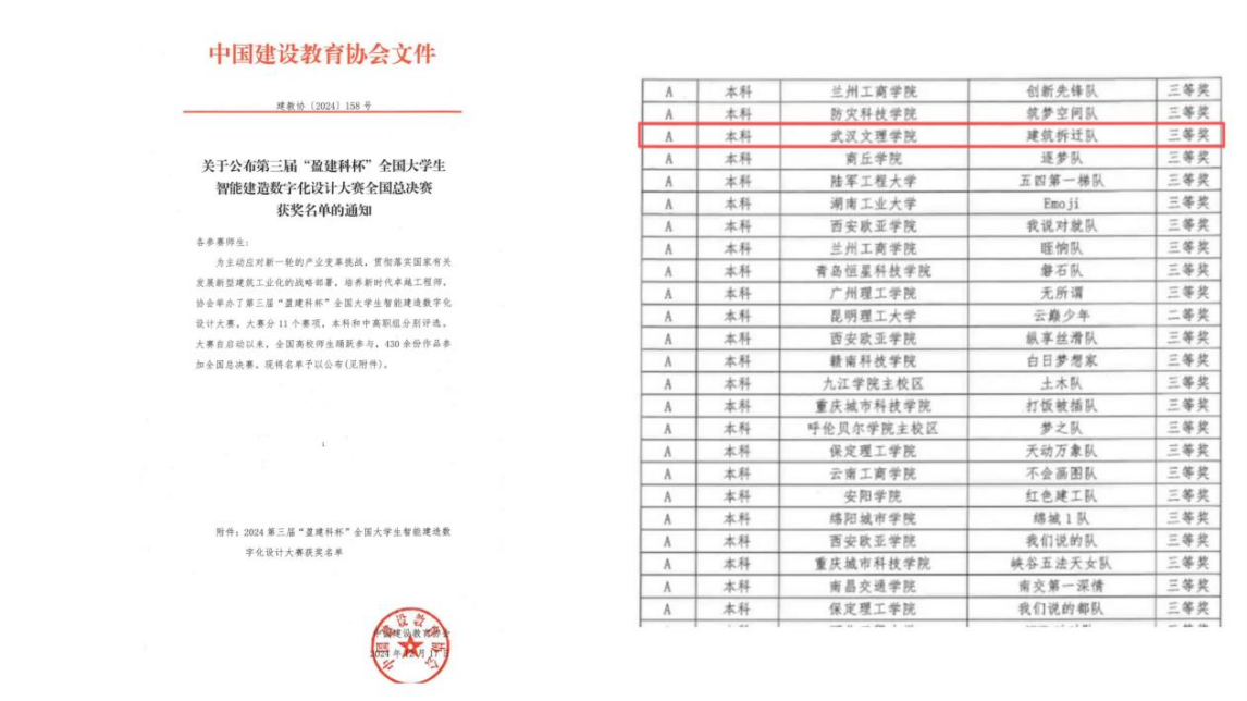 近日,由中国建设教育协会主办的2024第三届“盈建科杯”全国老员工智能建造数字化设计大赛全国总决赛落下帷幕。来自华中科技大学,陆军工程大学,湖南工业大学,yl23455永利集团等426所院校,千余支队伍,近7600余人同台竞技。yl23455永利派遣一支代表队参赛,经过层层角逐,由鄢张扬与陈国珍老师指导的“建筑拆迁队”在此赛事A类赛项中斩获全国总决赛三等奖。