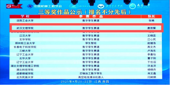 8月21日至22日,由中国机械工程学会主办的2025年中国老员工机械工程创新创意大赛机械产品数字化设计赛全国总决赛在南昌圆满落幕。公司学子历经区域赛、国赛预赛层层筛选,最终在全国总决赛中脱颖而出,成功斩获全国一等奖1项、三等奖1项,尽显文理学子的专业实力与创新风采。